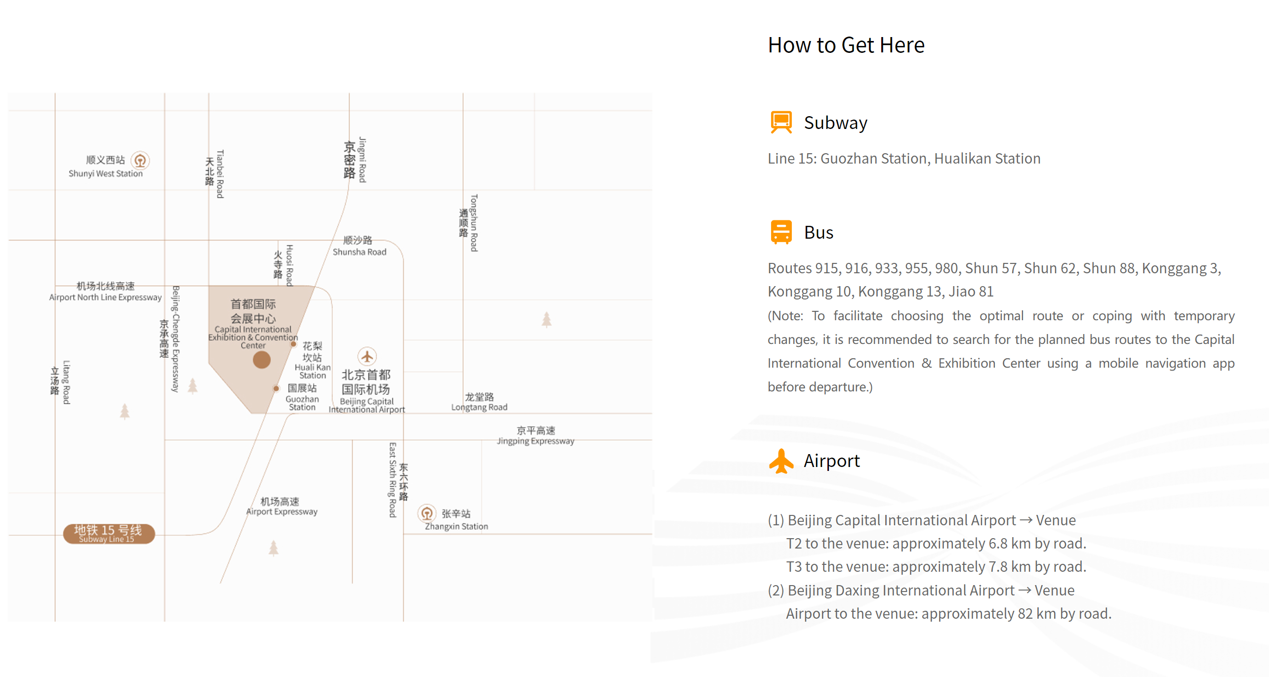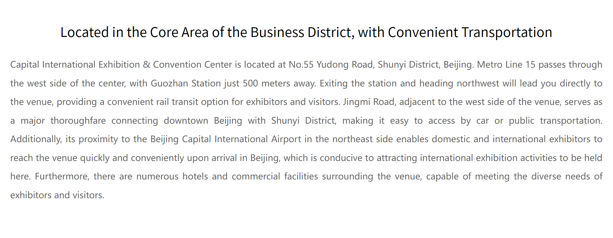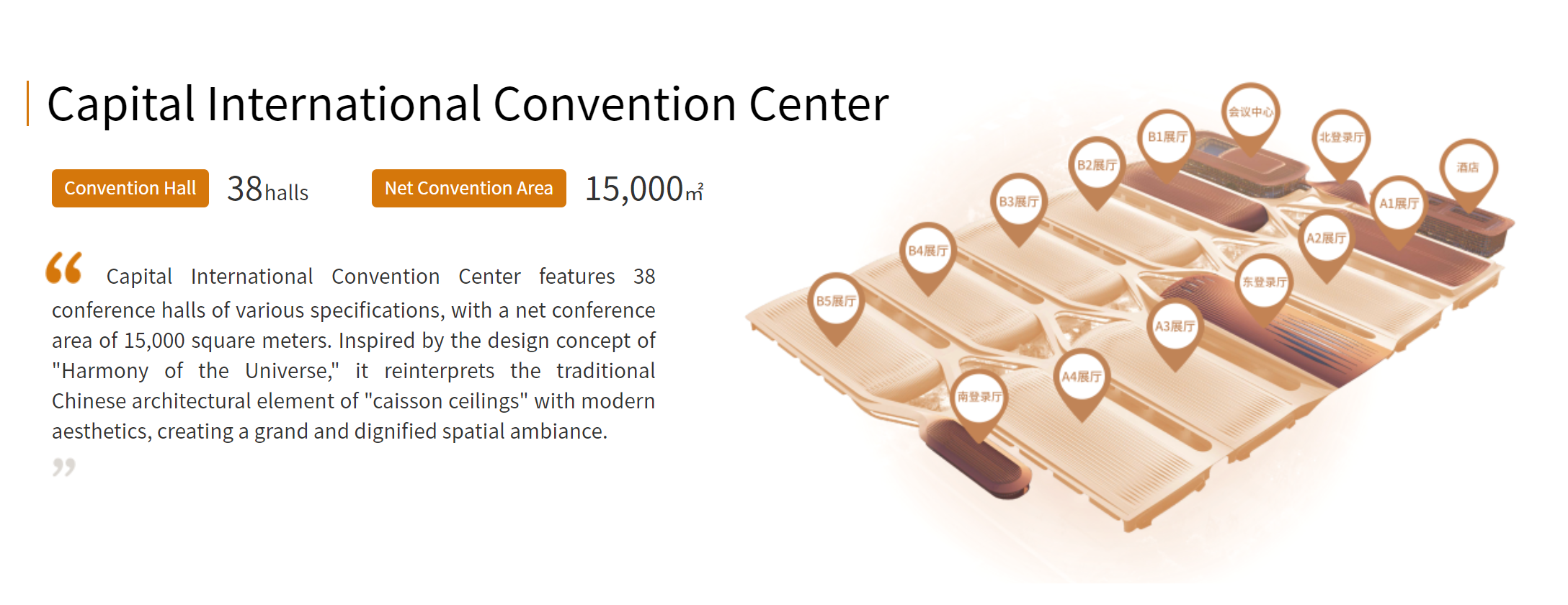 Capital International Exhibition & Convention Center (CIECC), entrusted for operation by Beijing Capital Group Exhibitions & Events, a subsidiary of North Star Group, has deepened its cooperation with the GL Events Group from France to jointly establish an international and professional management team. Located at No.55 Yu Dong Road, Shunyi District, Beijing, the venue covers a total construction area of 611,000 square meters and comprises three parts: an exhibition center, a convention center, and supporting hotels. The overall design of the venue is inspired by the "Purple Silk Ribbon," featuring a fishbone layout that symbolizes the joint construction of the "Belt and Road" and expresses the interconnectedness between China and the world. As a significant platform for Beijing's service expansion and opening up, Capital International Exhibition & Convention Center is poised to become the primary host for large-scale exhibition events in the capital. It provides hardware support to attract more high-level international events to be held in Beijing, promote the high-quality development of Beijing's exhibition industry, and realize the "stimulating" effect of exhibition activities on the socio-economy.